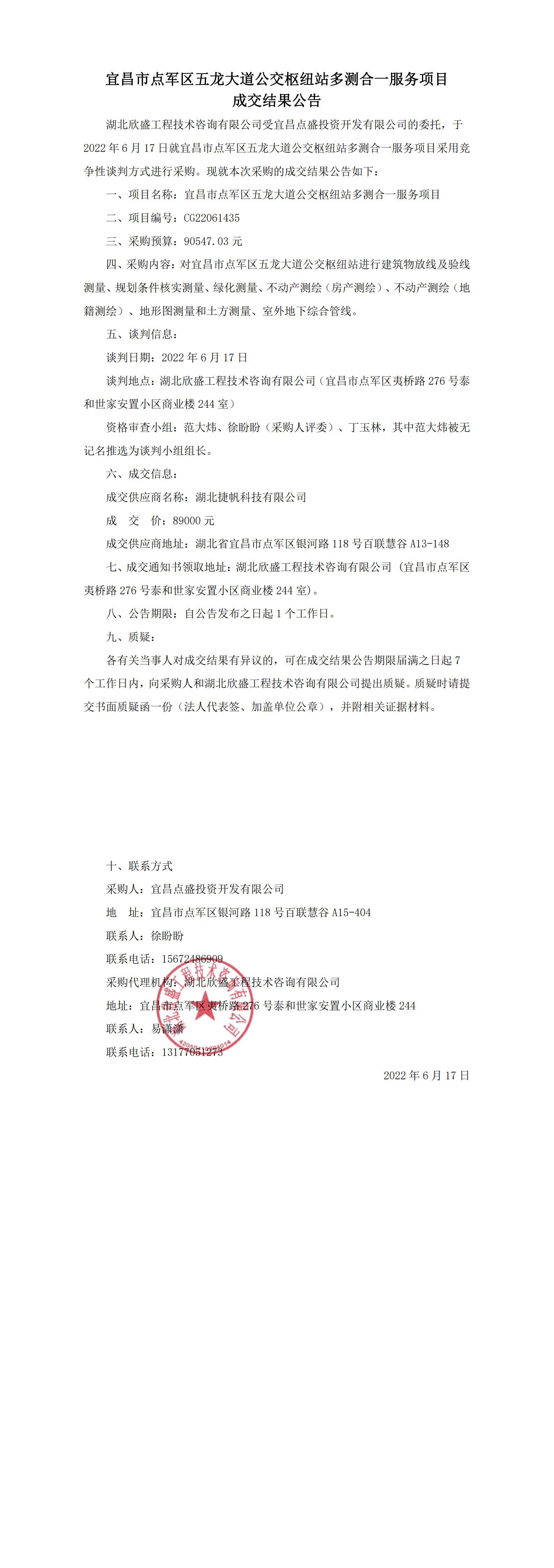 宜昌市點(diǎn)軍區(qū)五龍大道公交樞紐站多測合一服務(wù)項(xiàng)目成交結(jié)果公告